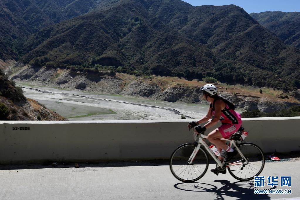 6月24日,一名女子騎車經過美國加利福尼亞州洛杉磯縣阿祖薩市附近的圣加布里埃爾水庫。