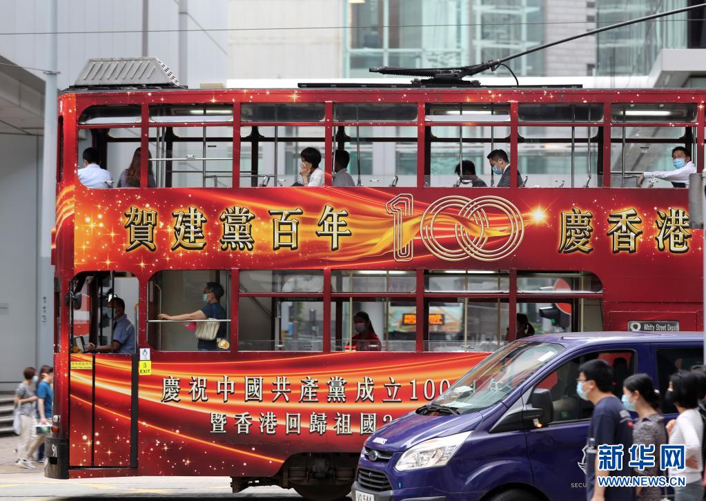 6月29日在香港街頭拍攝的叮叮車上的慶祝標(biāo)語。