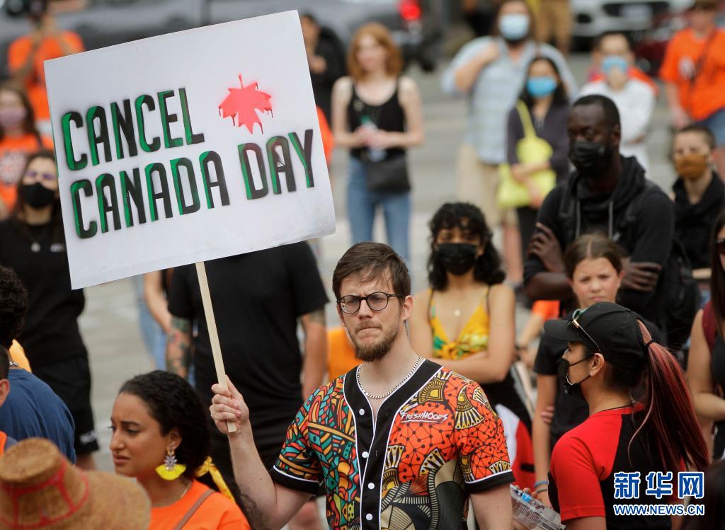 當(dāng)天是加拿大日,上千名抗議者在溫哥華集會,悼念加拿大在強(qiáng)制“同化”原住民過程中遭到殘害的兒童,呼吁取消加拿大日的慶祝活動。