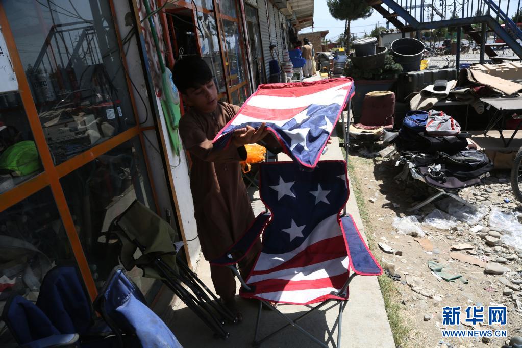 7月3日,在阿富汗帕爾萬省的巴格拉姆空軍基地附近,當地居民在美軍遺留下的物品中回收廢舊物。
