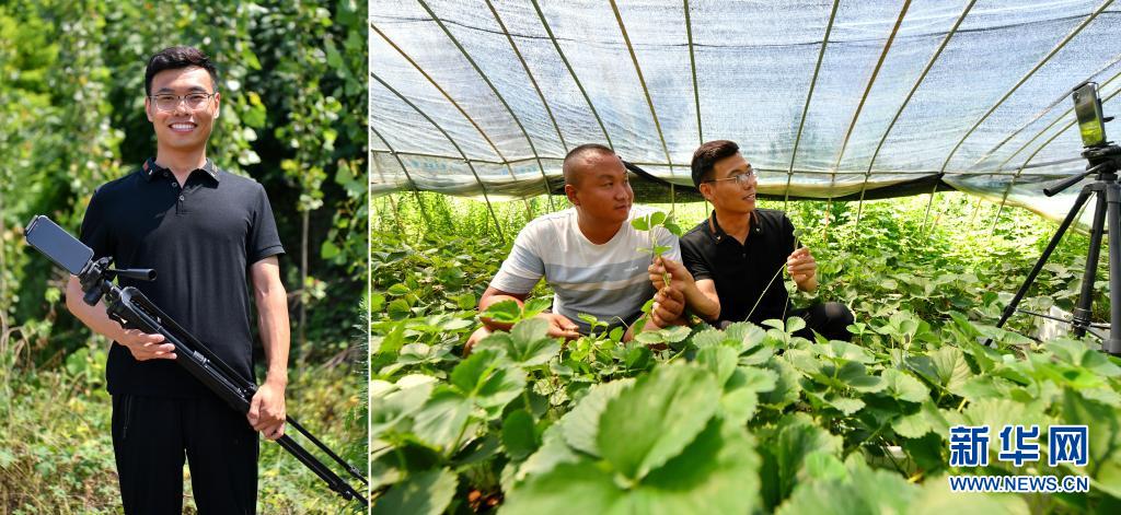 拼版照片:左圖為張成蘊在山西省運城市絳縣臨澮村的田間;右圖為張成蘊(右)在大棚里錄制農業科普視頻(7月14日攝)。今年34歲的張成蘊大學畢業后,一直熱衷于用拍攝視頻的方式宣傳家鄉的風土人情。2018年8月,他開始在社交平臺上幫助鄉親們直播帶貨,真誠的笑容、優質的產品和專業的知識是他吸引粉絲的“訣竅”。