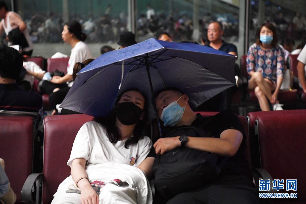 7月20日,旅客滯留在鄭州東站。候車廳出現漏雨情況,旅客撐傘擋雨。