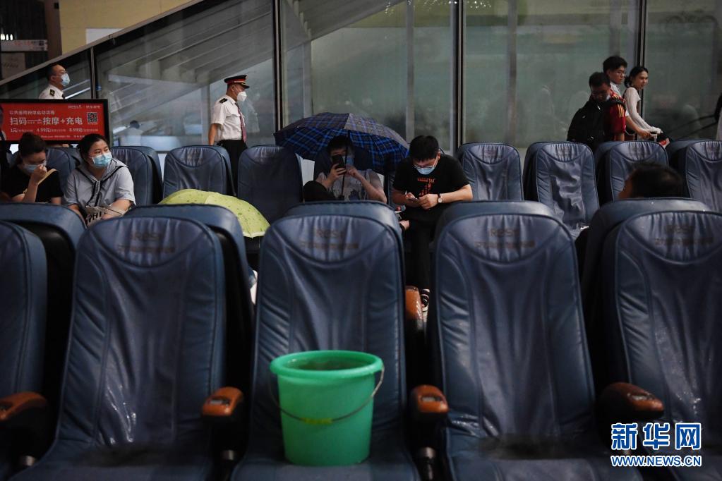 7月20日,旅客滯留在鄭州東站。候車廳出現漏雨情況,旅客撐傘擋雨。