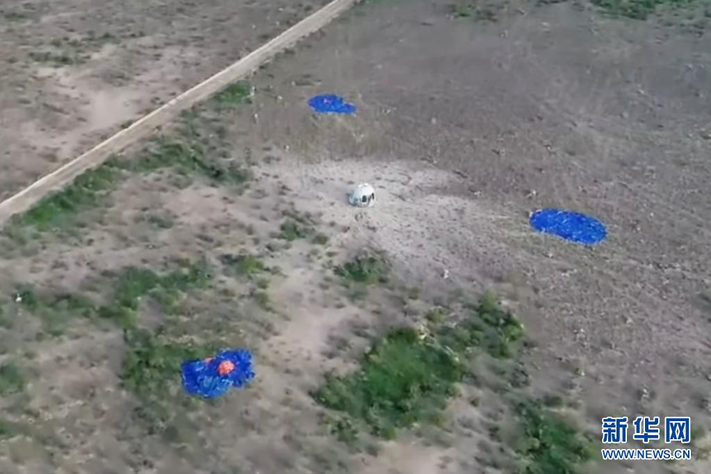 這張美國藍色起源公司7月20日發布的視頻截圖顯示“新謝潑德”飛行器在美國得克薩斯州西部著陸。