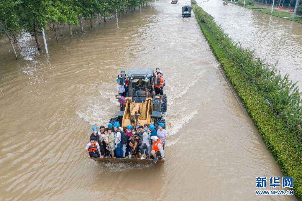 7月22日,在阜外華中心血管病醫院附近的錦繡路與鄭開大道交叉口,救援人員利用鏟車轉移人員(無人機照片)。