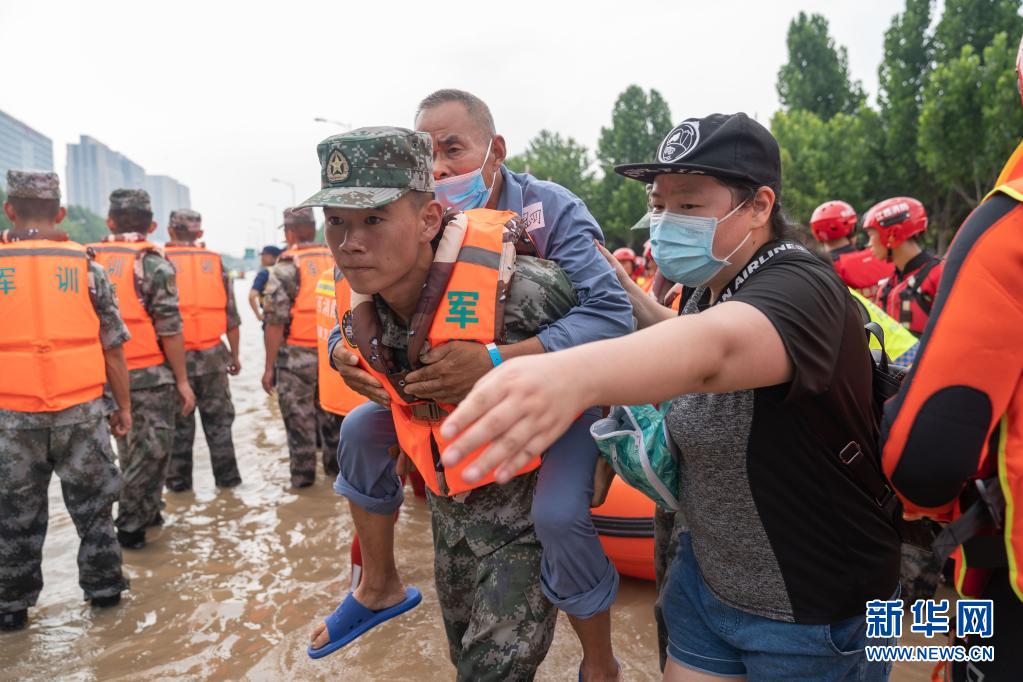 7月22日,在阜外華中心血管病醫院附近的錦繡路與鄭開大道交叉口,救援人員轉移病患。