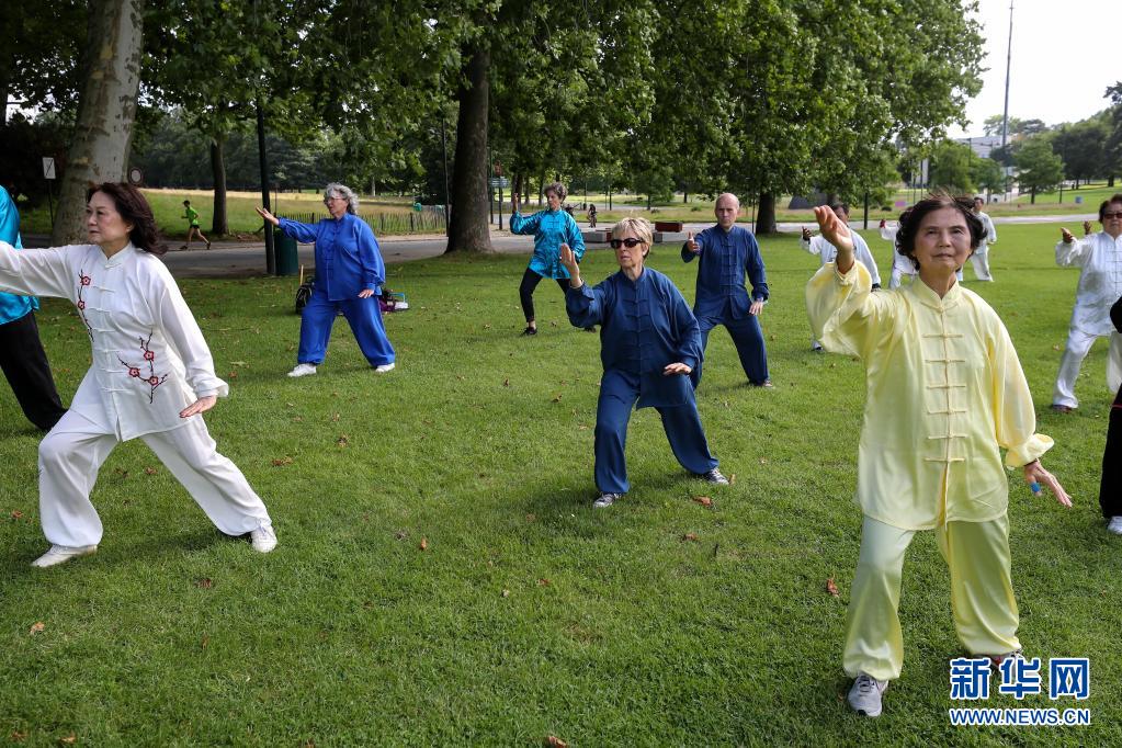 7月28日,人們在比利時(shí)布魯塞爾的拉肯公園練習(xí)太極。