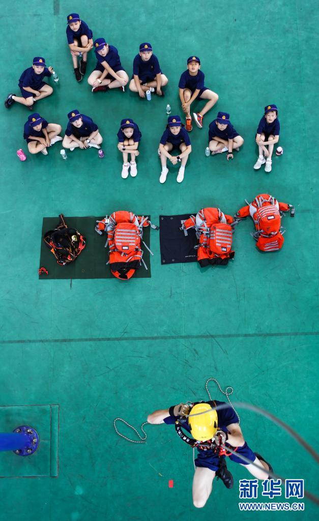在四川省森林消防總隊(duì)特勤大隊(duì),孩子們?cè)谟^摩繩索高空救援(7月27日攝)。