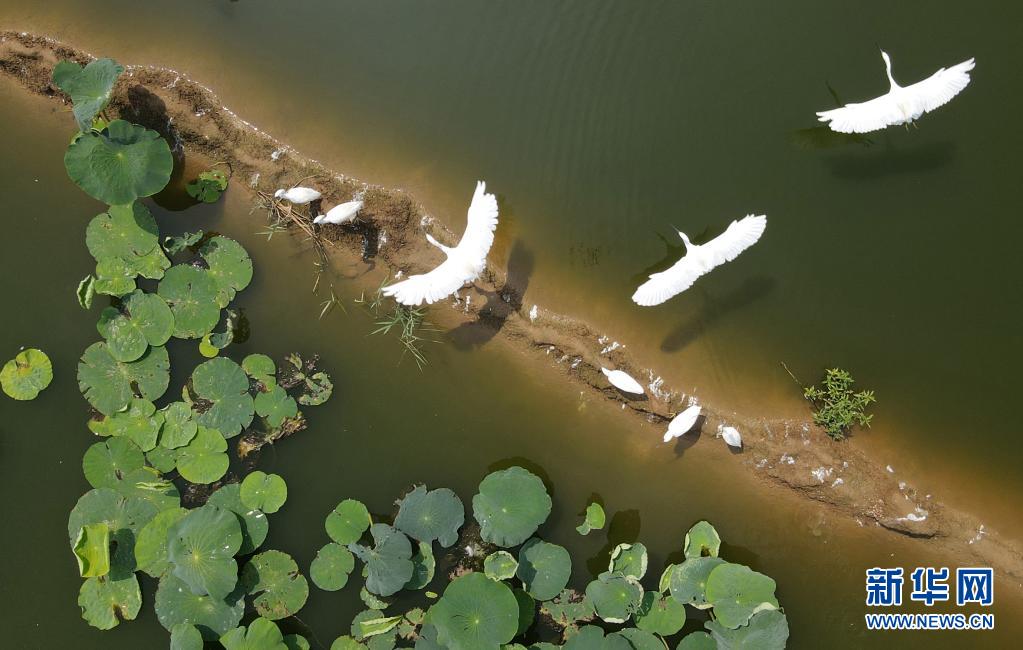 8月3日,白鷺在河北省新河縣白穴口村的藕田上空飛舞(無人機(jī)照片)。