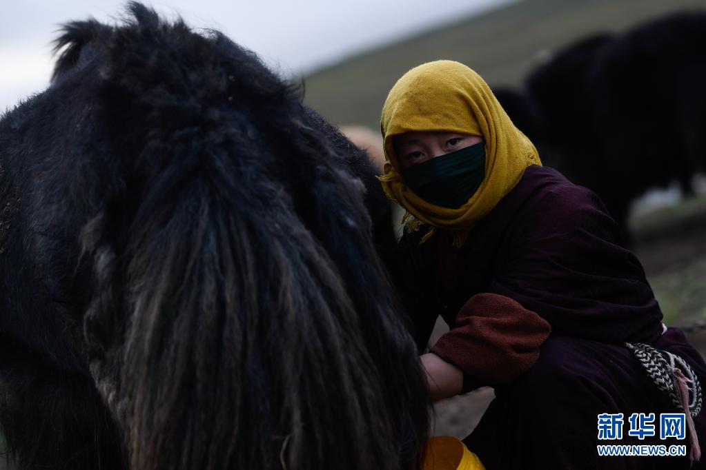 8月3日,在瑪沁縣當洛鄉貢龍村的夏季草場上,牧民在擠奶。