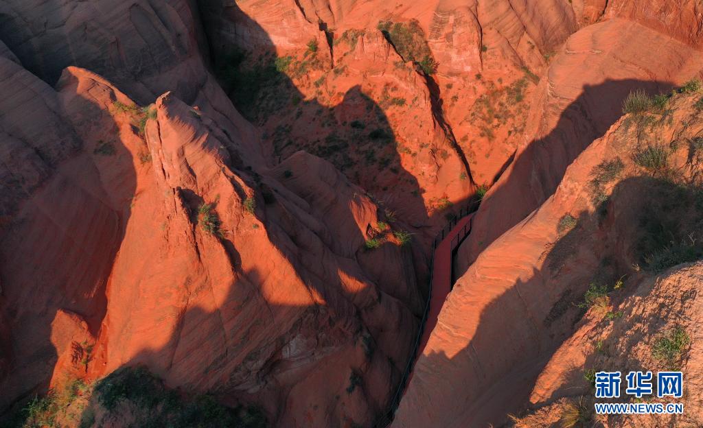 陜西省靖邊縣龍洲鎮波浪谷丹霞景區地處陜北黃土高原,峽谷四面環山,線谷、巷谷、絕壁等構成了特有的波浪形砂巖地貌,景觀獨特。