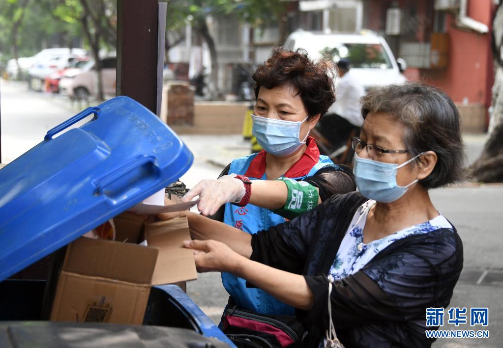 在北京市海淀區(qū)薊門里社區(qū),董星梅(左)指導社區(qū)居民進行垃圾分類投放(8月11日攝)。