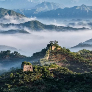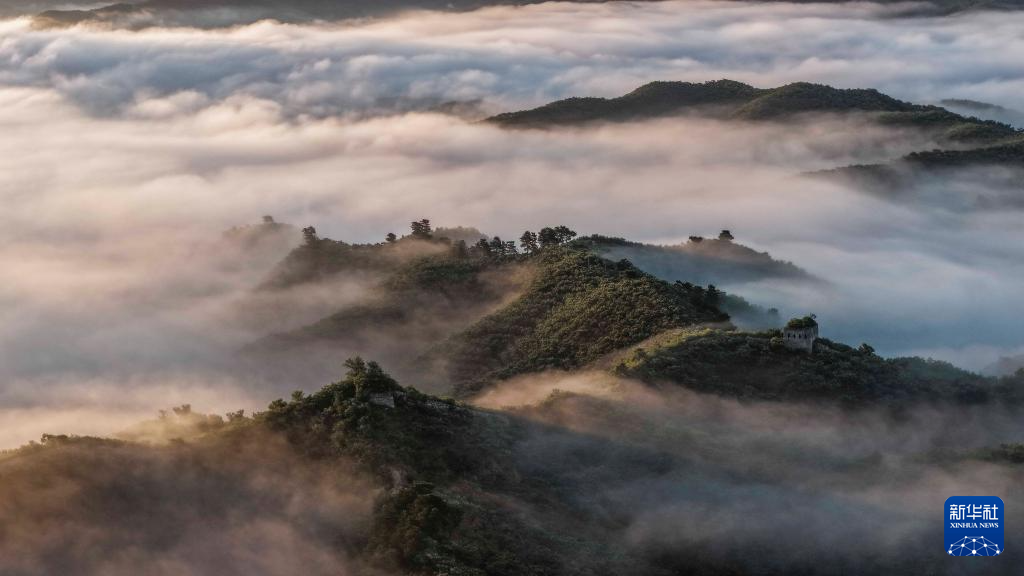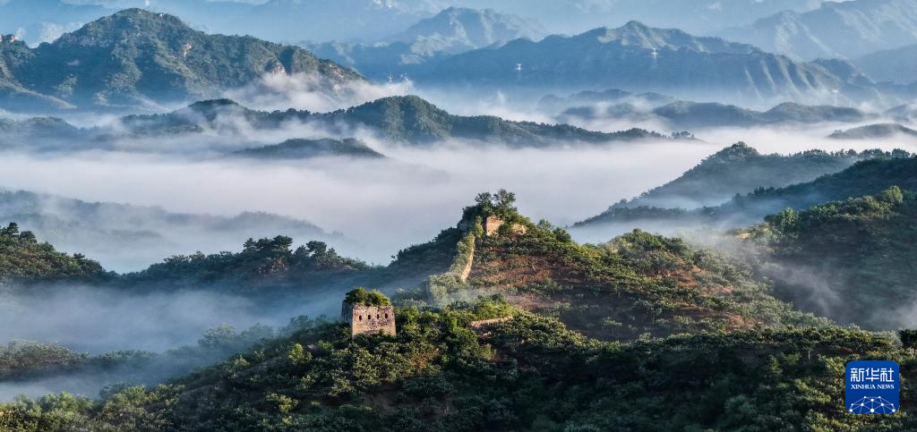 7月13日清晨,雨后的河北省遵化市境内洪山口古长城云蒸霞蔚,古长城、云海、山峦浑然一体,壮美如画(无人机照片)。