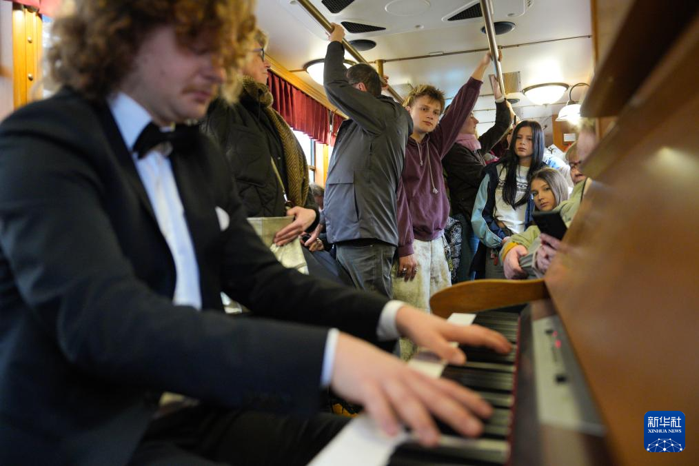 10月9日,在波兰华沙的“肖邦电车”上,一名钢琴家为乘客演奏肖邦作品。