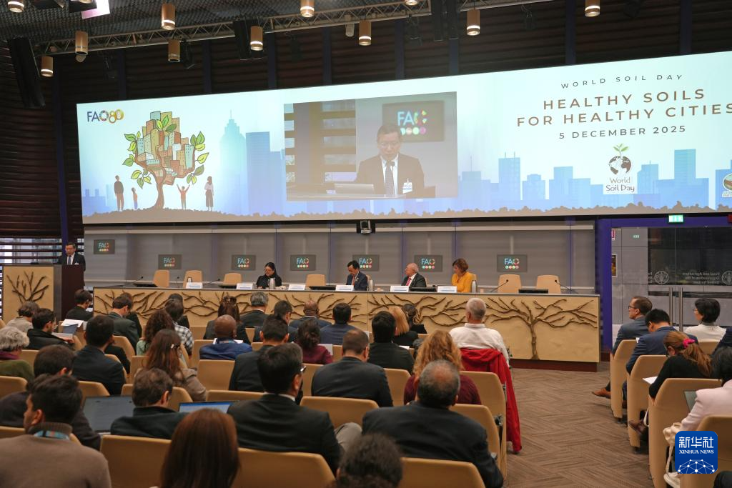 12月5日,在意大利首都罗马,联合国粮农组织总干事屈冬玉(左)在活动现场讲话。