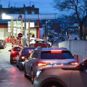 3月9日,车辆在西班牙首都马德里一处加油站排队加油。