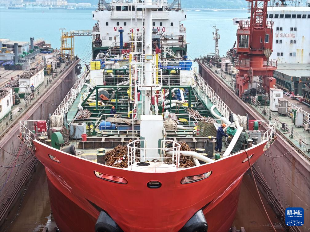 4月27日,在江苏省连云港鸿云实业有限公司生产基地,一艘船舶正在建设中(无人机照片)。