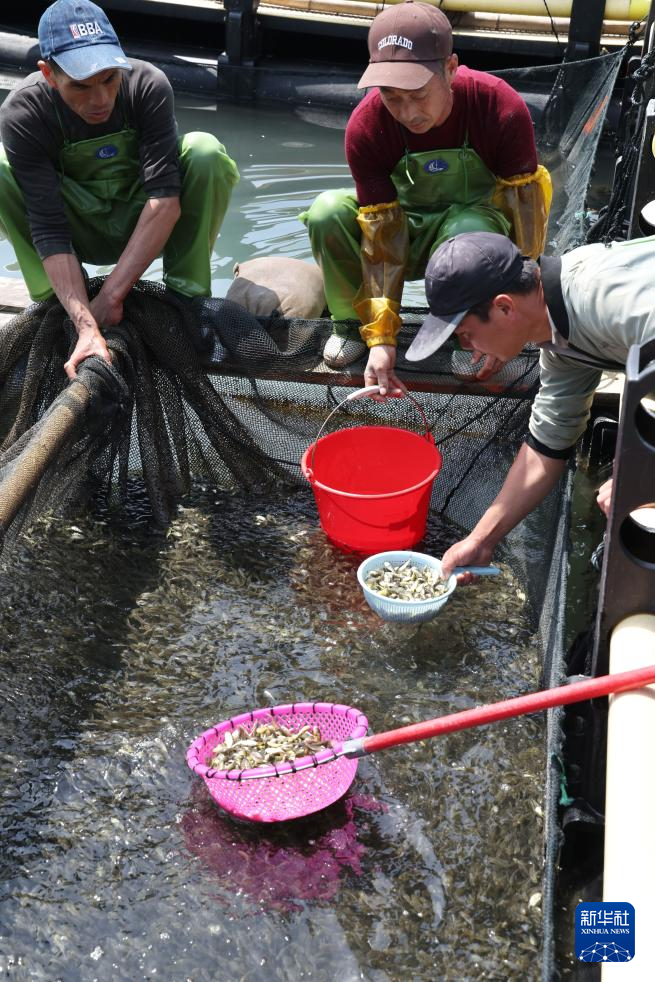 4月25日,在福建省宁德市霞浦县下浒镇海上养殖区,养殖户将大黄鱼鱼苗投放至渔排。