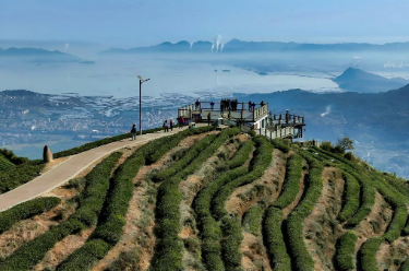 游客在位于福州市连江县炉峰山上的观景平台观赏山海风景。