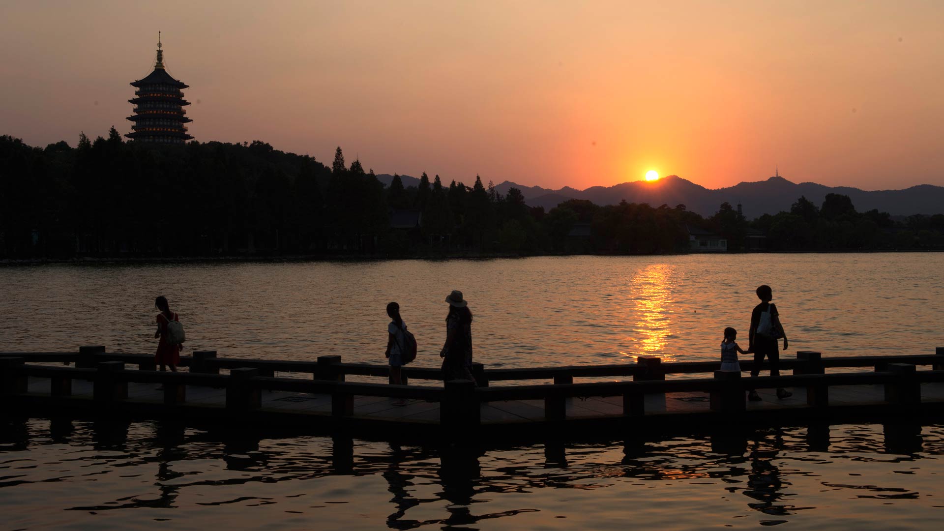 雷峰塔和西湖長橋(8月29日攝)。 西湖自然和歷史原貌逐步恢復。2002年起,杭州實行“西湖免費開放”,西湖環湖公園全線打通后,不設圍墻、不收門票,西湖美景成為人人能享受的公共產品。(新華社記者 張鋮 攝)