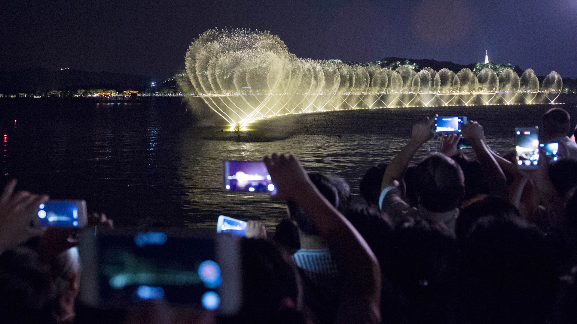 8月24日,游客在西湖邊欣賞西湖音樂噴泉。 2011年6月24日第35屆世界遺產大會審議表決,“杭州西湖文化景觀”入選世界遺產名錄。9月初,G20峰會將在杭州舉行,西湖這座承載了悠久文化的名湖也將迎來更多來自世界各地的客人。(新華社記者 鞠煥宗 攝)