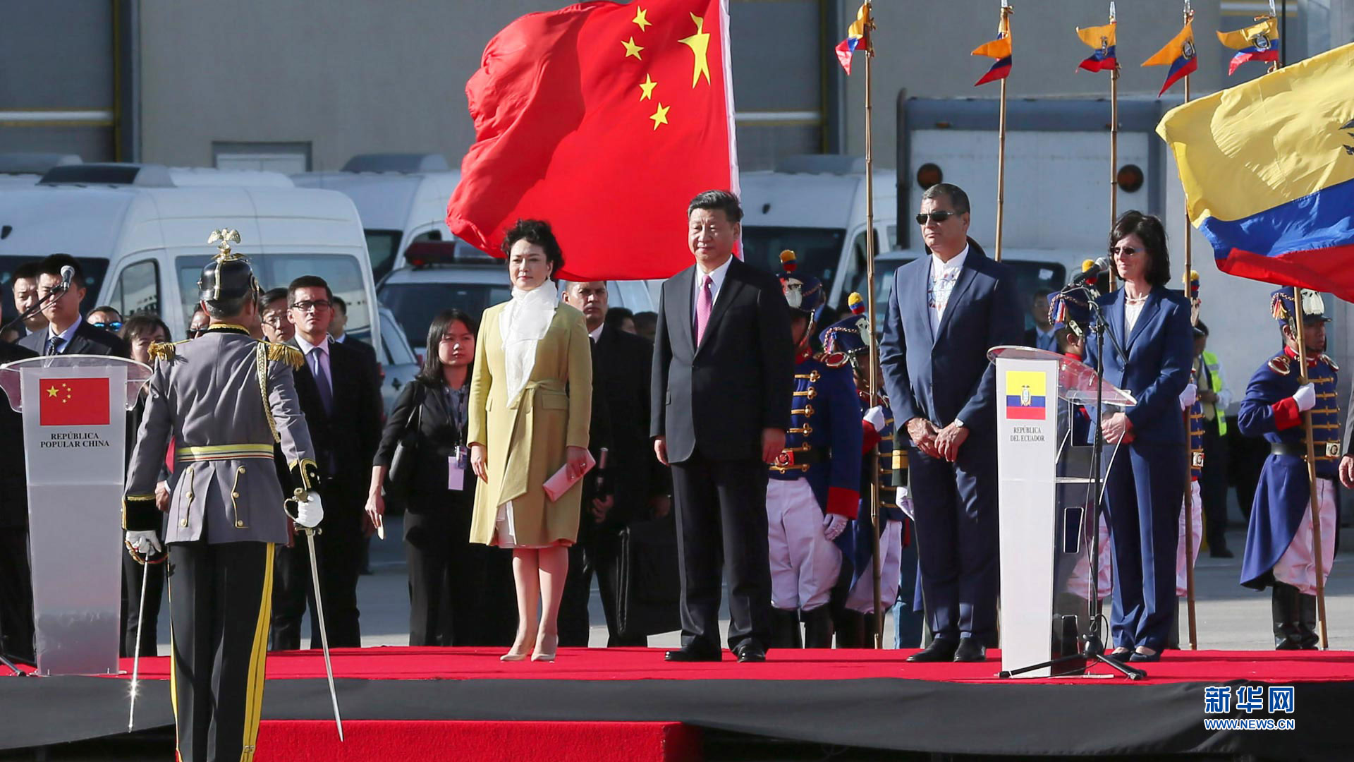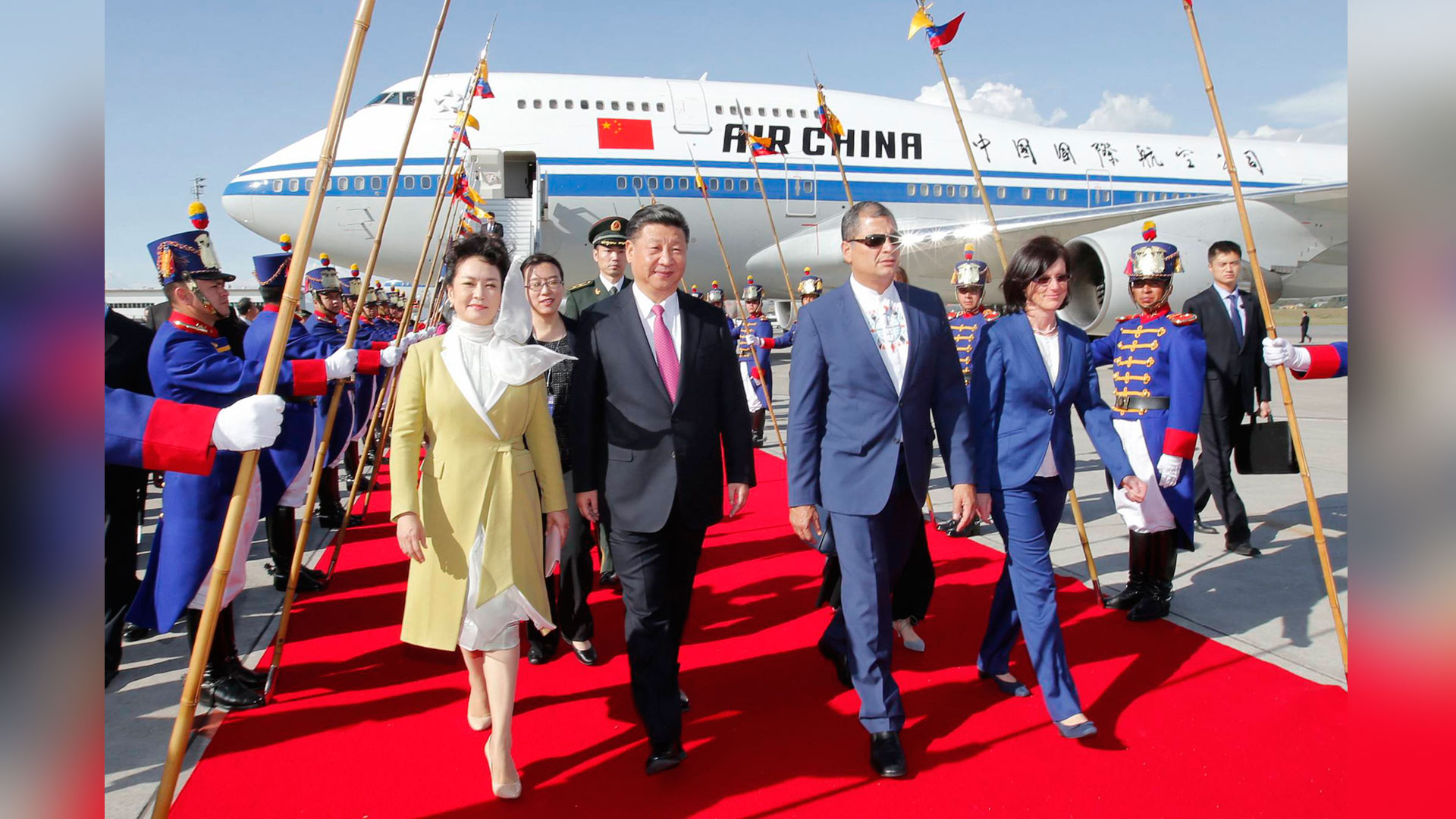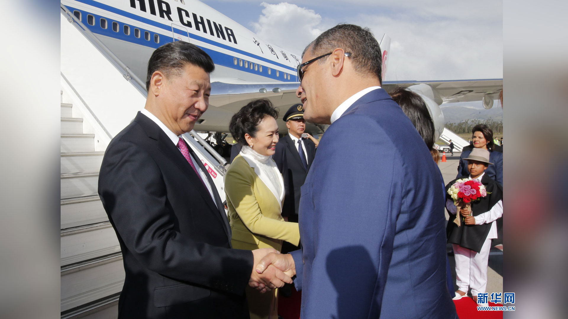 當地時間11月17日,國家主席習近平乘專機抵達基多,開始對厄瓜多爾共和國進行國事訪問。厄瓜多爾總統科雷亞和夫人馬勒布等在機場熱情迎接習近平和夫人彭麗媛。新華社記者 鞠鵬 攝2016-11-18