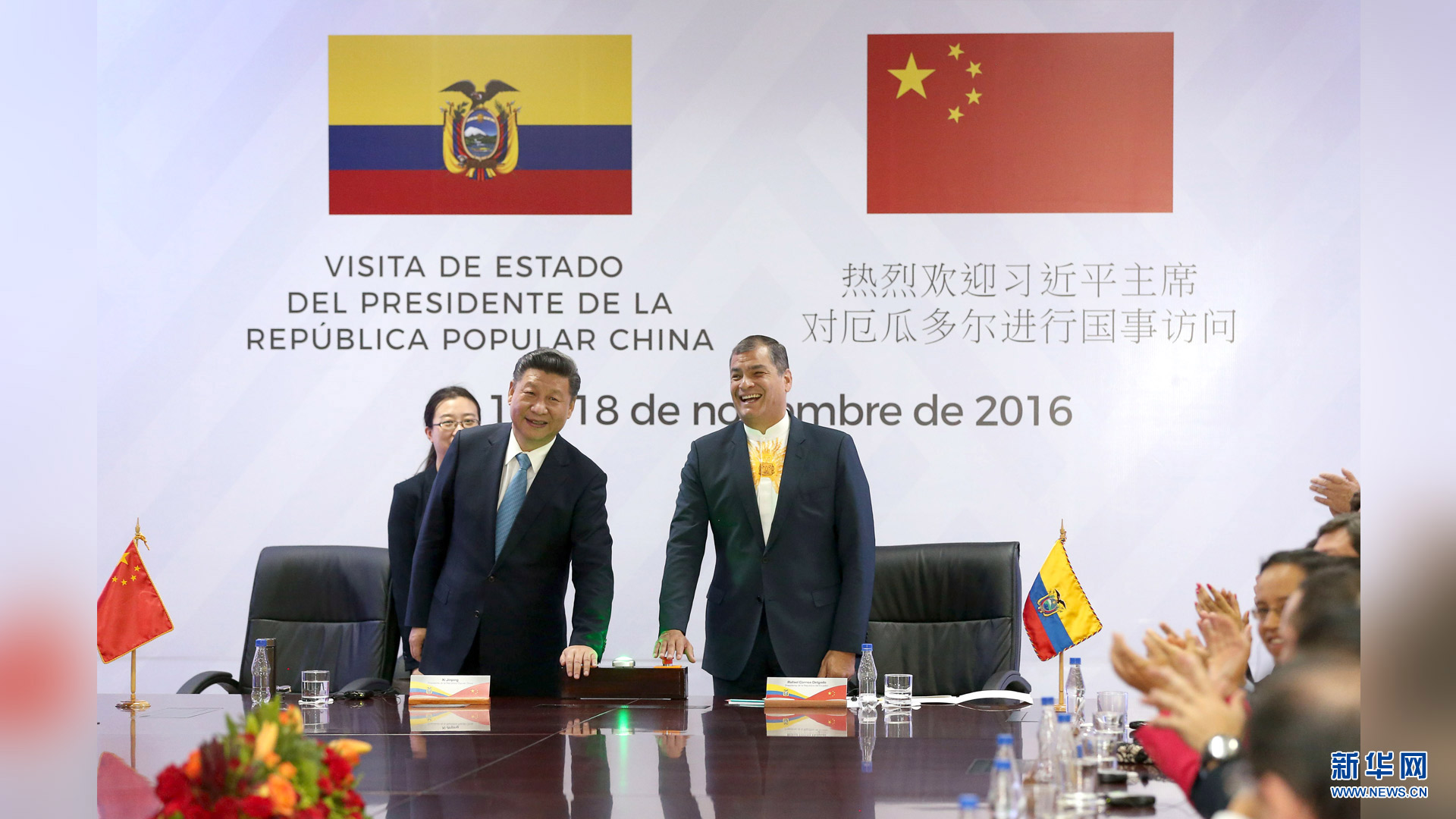 當地時間11月18日,國家主席習近平在基多同厄瓜多爾總統科雷亞共同出席中方援建的厄瓜多爾公共安全應急指揮中心聯合實驗室揭牌儀式,喬內醫院奠基、科卡科多-辛克雷水電站竣工發電視頻連線活動。這是兩國元首共同按動按鈕,辛克雷水電站正式竣工發電。新華社記者 馬占成 攝2016-11-19