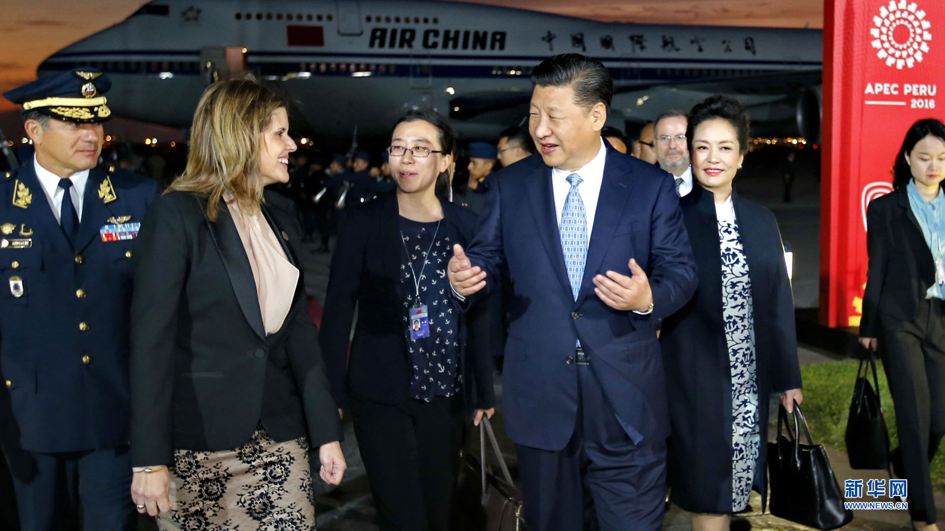 當地時間11月18日,國家主席習近平抵達利馬,出席亞太經合組織第二十四次領導人非正式會議并對秘魯共和國進行國事訪問。習近平和夫人彭麗媛受到秘魯副總統阿勞斯等熱情迎接。新華社記者 鞠鵬 攝2016-11-20