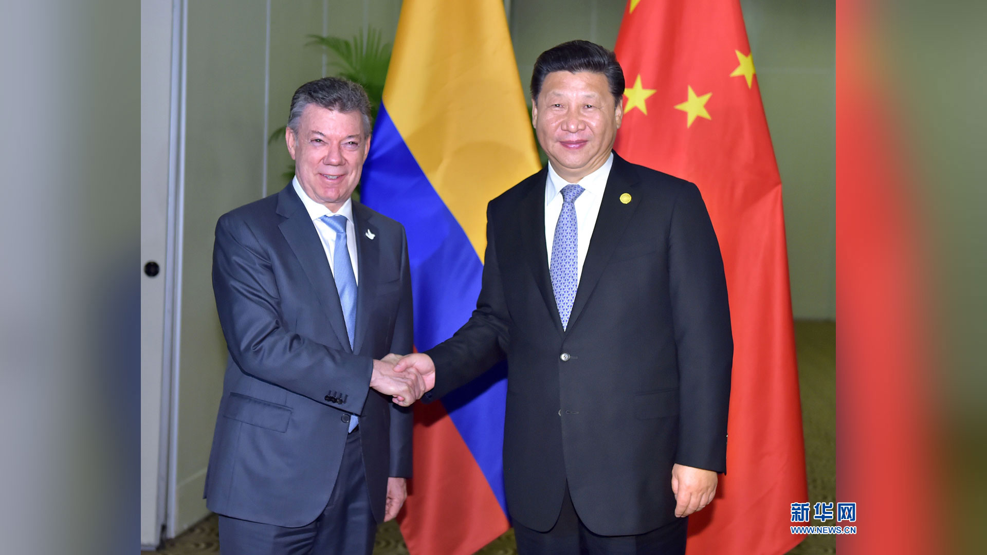 11月19日,國家主席習近平在利馬會見哥倫比亞總統桑托斯。新華社記者 龐興雷 攝2016-11-20