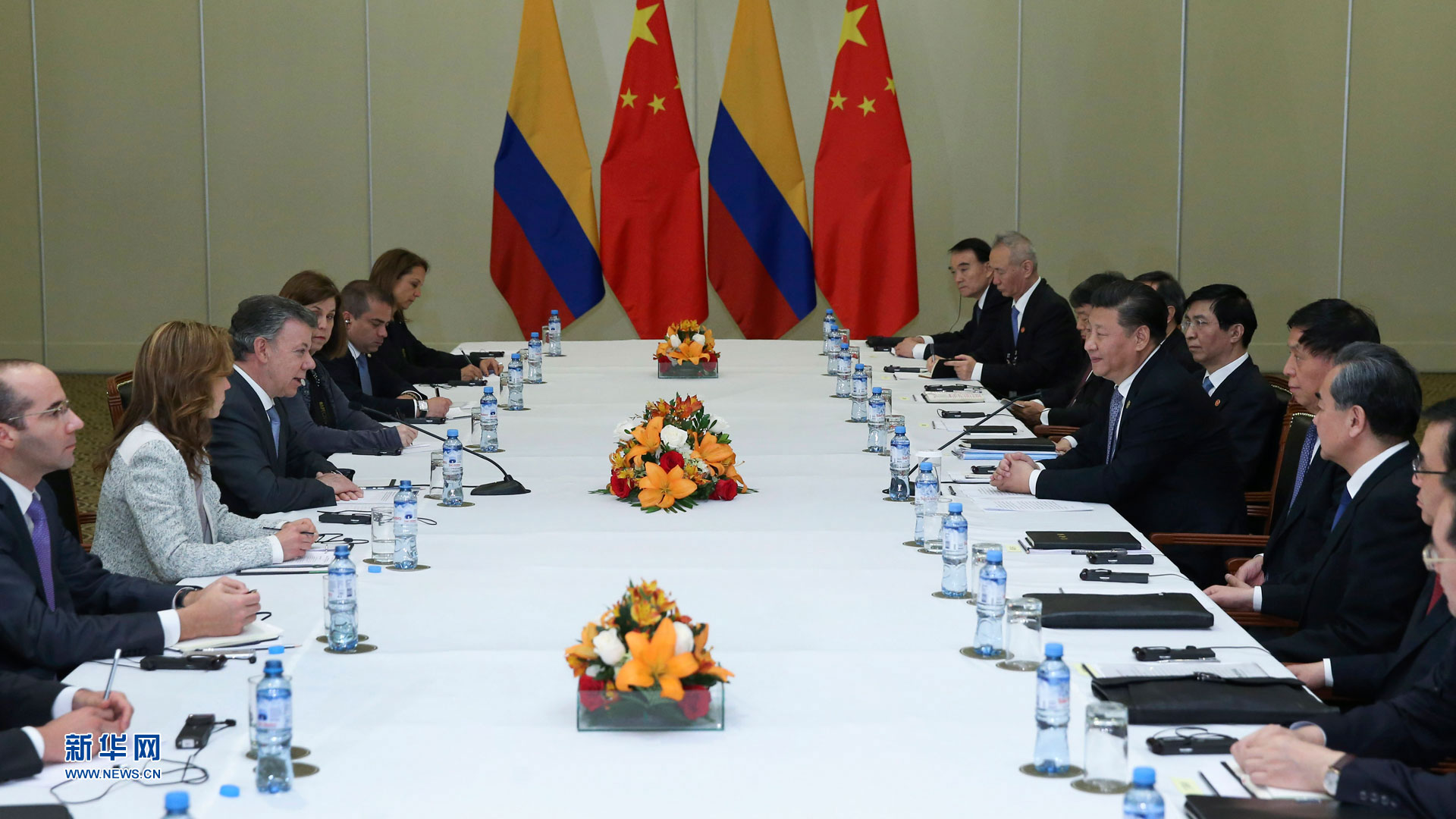 11月19日,國家主席習近平在利馬會見哥倫比亞總統桑托斯。新華社記者 李濤 攝2016-11-20