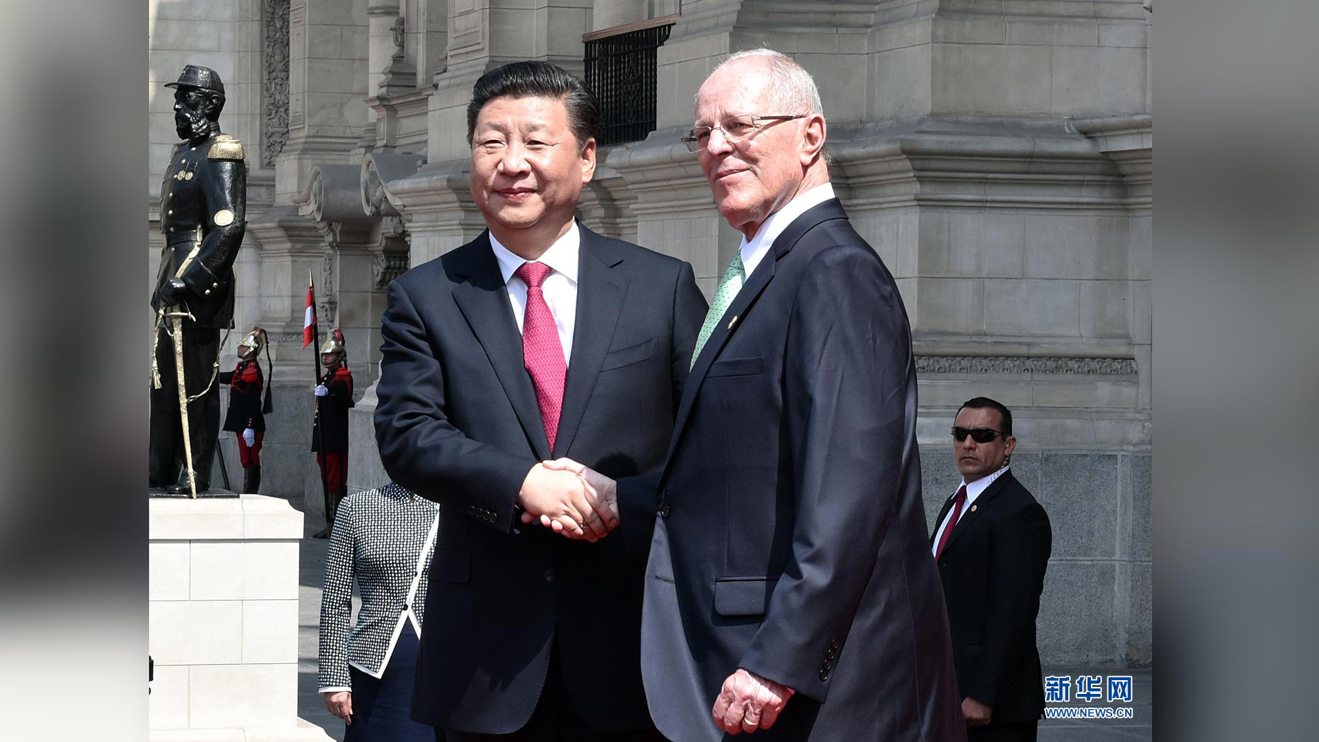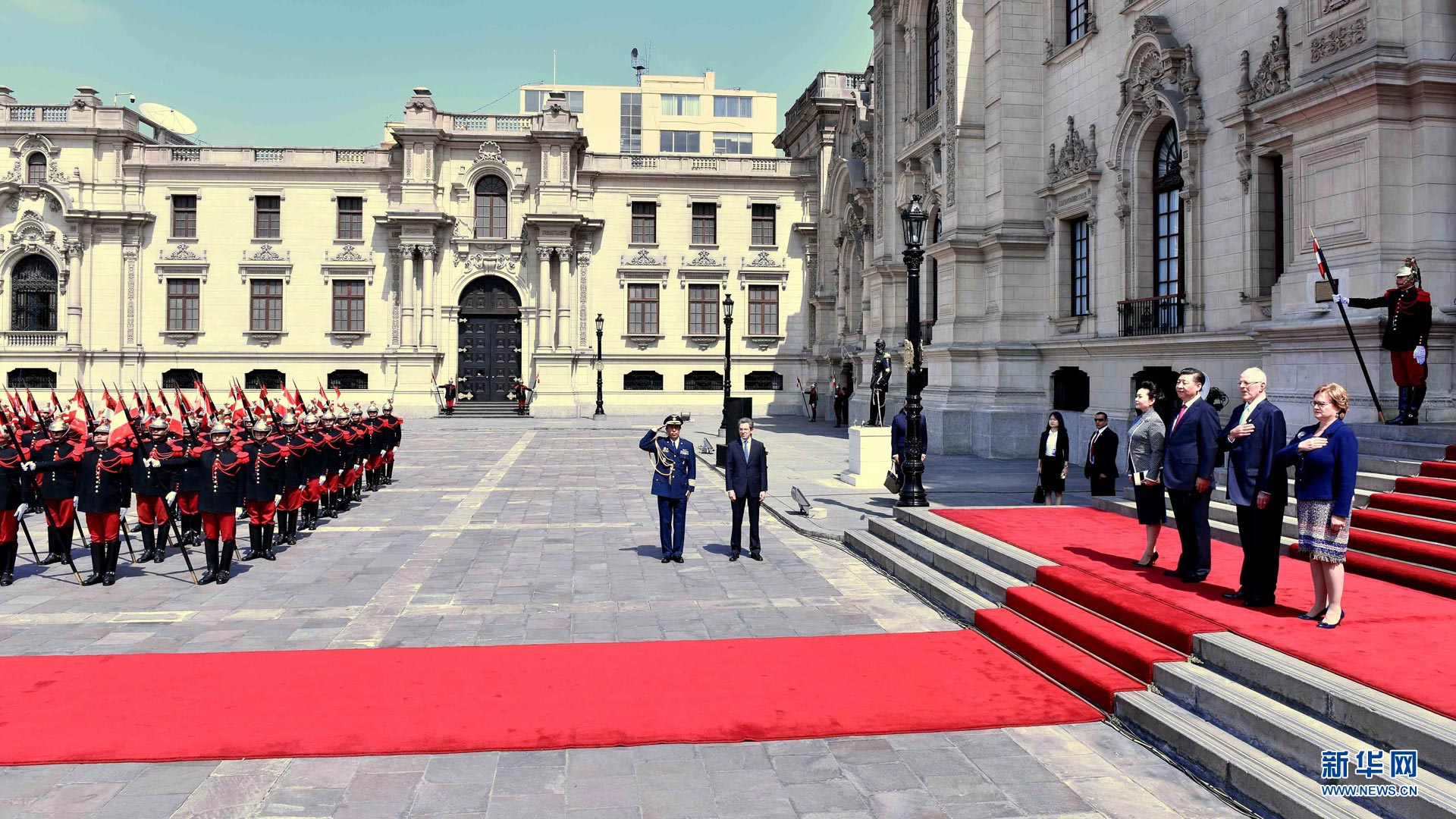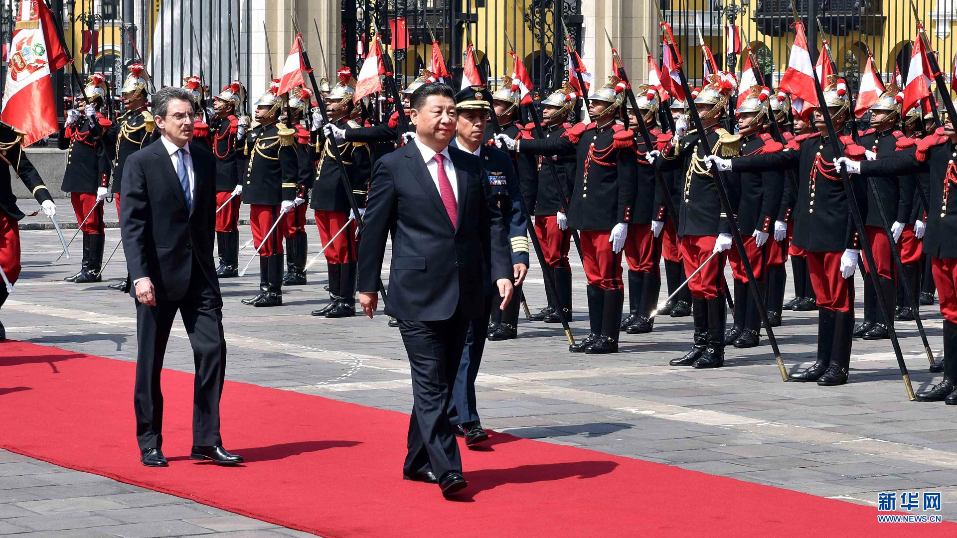 11月21日,國家主席習近平在利馬同秘魯總統庫琴斯基舉行會談。會談前,習近平出席庫琴斯基在總統府前廣場舉行的歡迎儀式。 新華社記者李濤 攝2016-11-23