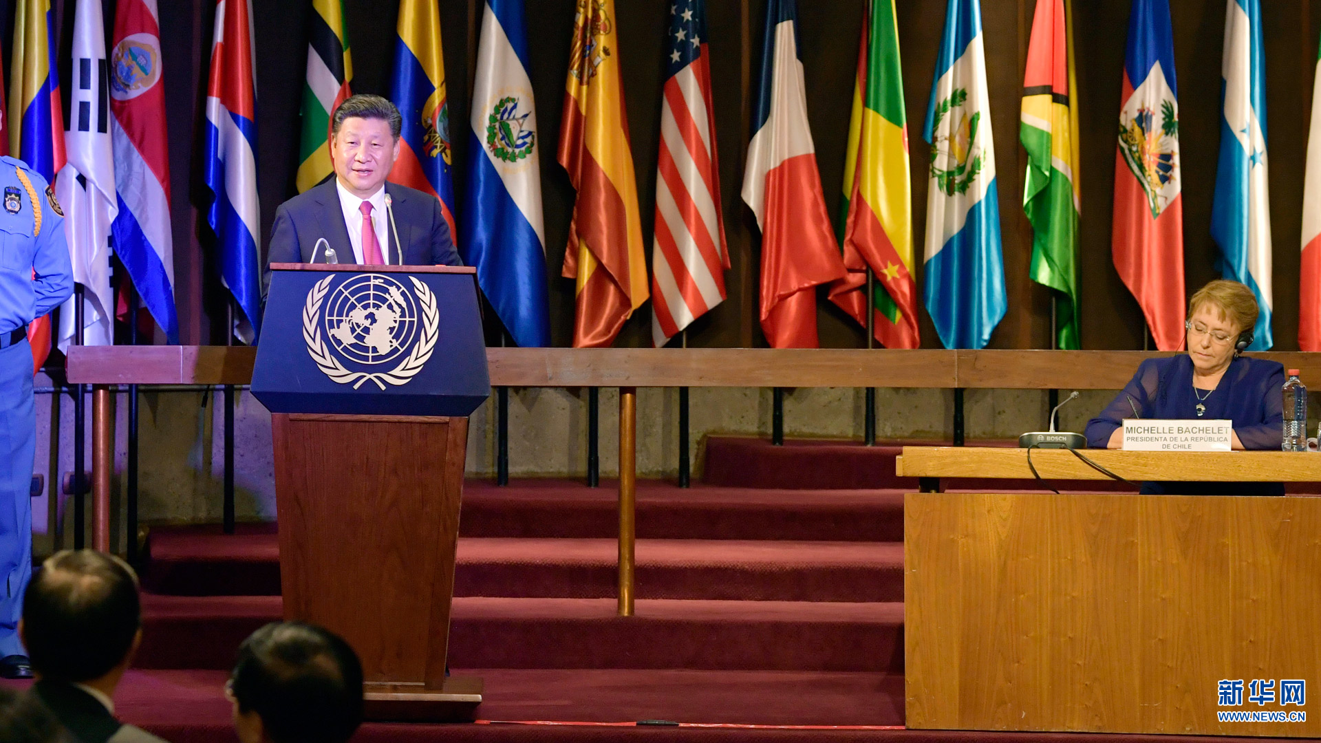 11月22日,國家主席習近平在圣地亞哥聯合國拉丁美洲和加勒比經濟委員會總部出席中拉媒體領袖峰會開幕式。智利總統巴切萊特陪同出席。在熱烈的掌聲中,習近平發表題為《開創中拉媒體合作新局面》的致辭。新華社記者 王曄 攝2016-11-23