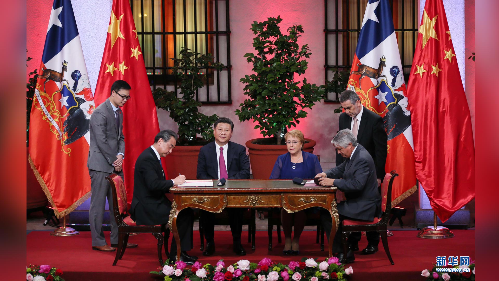 11月22日,國家主席習近平在圣地亞哥同智利總統巴切萊特舉行會談。這是會談后,兩國元首見證經貿、農業、質檢、文化、教育、電子商務、信息通信、金融等領域多項雙邊合作文件的簽署。新華社記者 蘭紅光 攝2016-11-23