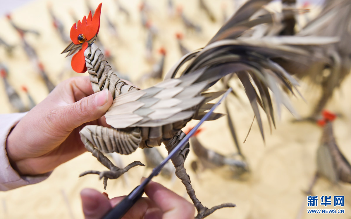 1月15日,洛陽棕編藝人賈淑娟修剪“金雞”棕編作品。為迎接雞年到來,河南洛陽棕編藝人賈淑娟歷時一個月創作出近百只活靈活現的“金雞”棕編作品,制作工序包括棕櫚葉的選材、熏蒸、陰晾、編制、組合、粘貼等。新華社發(黃政偉 攝)