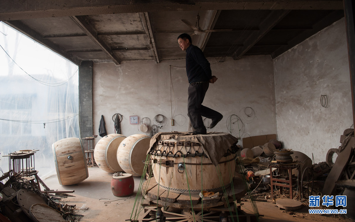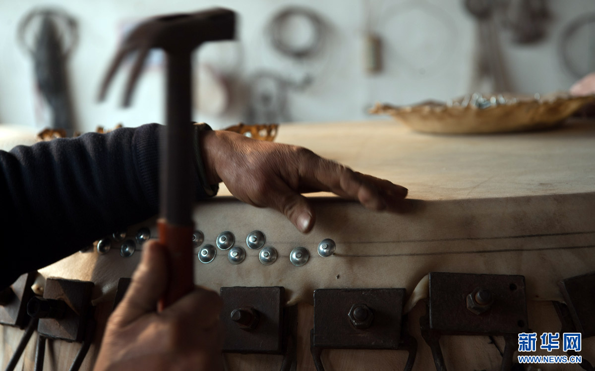 1月17日,在藁城黃家莊河北名華樂器制作有限公司內,工人正在釘釘子固定鼓皮。河北石家莊藁城戰鼓表演及其制作工藝,2016年被評為河北省級非物質文化遺產。據藁城戰鼓的傳承人胡造寶介紹,藁城戰鼓源自架鼓,在清末時吸收了武術動作,演變成了戰鼓。藁城戰鼓表演時配合鑼、鈸一起演奏,鼓點激昂,讓人振奮。藁城戰鼓需經過挖鼓幫、蒙鼓皮、踩鼓等近二十道工序,平均耗時十天左右才能制作完成。新華社發(蒲東峰 攝)