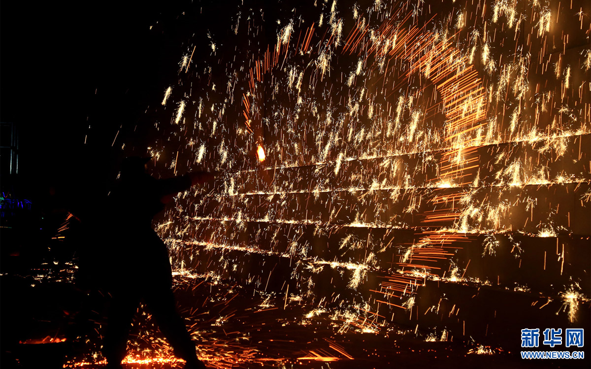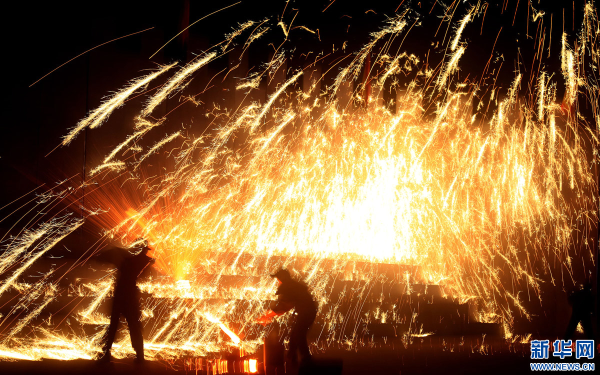1月12日,磁縣本地匠人在“打鐵花”。當日,河北磁縣開始舉行“打鐵花”慶新年活動。“打鐵花”是以小煉鐵爐將生鐵化成鐵水后,用木板將鐵水加鋸末打上天空,鋸末在空中燃燒形成“鐵花火雨”四濺飛揚的景象。打鐵花”是當地歷史悠久的民俗娛樂活動。新華社發 (趙鴻宇攝)