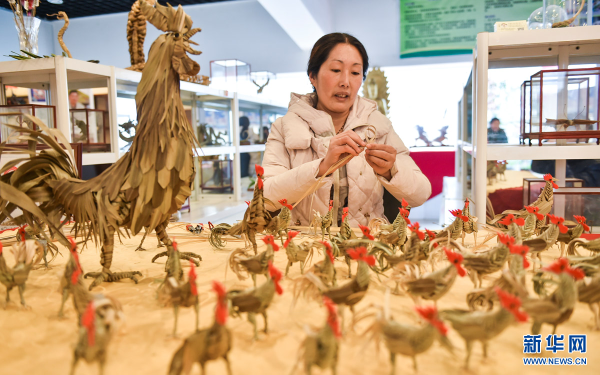 1月15日,洛陽棕編藝人賈淑娟在創作“金雞”棕編作品。為迎接雞年到來,河南洛陽棕編藝人賈淑娟歷時一個月創作出近百只活靈活現的“金雞”棕編作品,制作工序包括棕櫚葉的選材、熏蒸、陰晾、編制、組合、粘貼等。新華社發(黃政偉 攝)