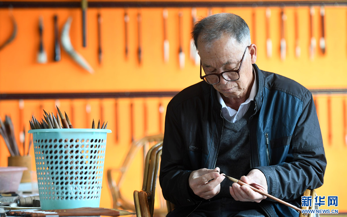 1月4日,在賓陽縣儒供毛筆生產有限公司,65歲的老工藝人羅儒供在檢查毛筆質量。在廣西賓陽縣賓州鎮大羅村,毛筆傳統制作工藝代代相傳至今已有300多年的歷史。20世紀70年代,毛筆加工是大羅村的一個重要產業,全村300多人投入毛筆加工生產,全年生產銷售毛筆超過100萬支,大羅毛筆成為遠近聞名的品牌。隨著毛筆銷售市場逐漸萎縮,目前,賓陽縣熟練掌握毛筆傳統生產工藝的手工藝人不超過10人,年紀大的已經超過80歲。在當地政府扶持建立的儒供毛筆生產有限公司,目前從事毛筆生產的只有6名傳統手工藝人,年生產毛筆2萬多支,每個人月收入不超過2000元。雖然如此,為了這門傳統技藝的傳承,幾名老工藝人在狹窄的市場空間和低微的經濟效益中不舍地堅守著。新華社記者 陸波岸攝