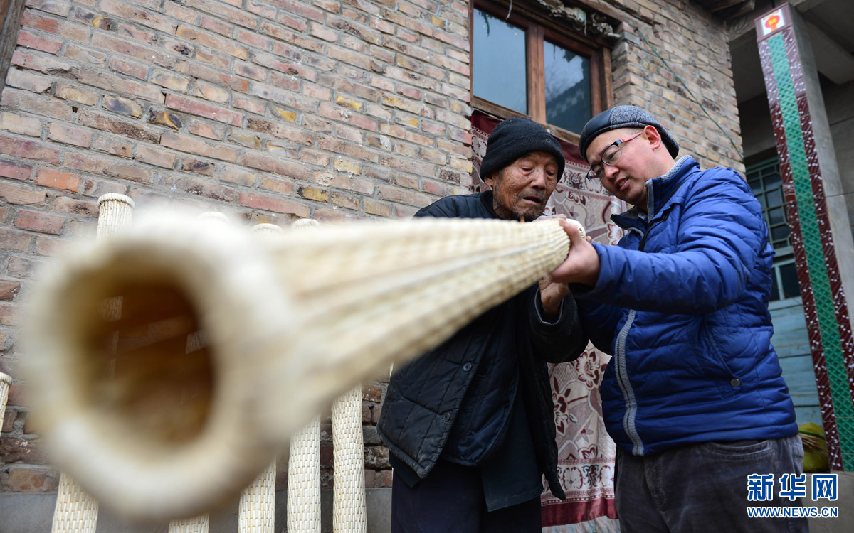 1月6日,在河北省廣宗縣,侯義敏(右)向82歲的柳編藝人馬振堂介紹柳編樂器雨棒的相關知識。