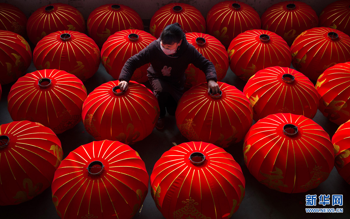 1月11日,在開明工藝宮燈制造有限公司內,一名工人在整理紅燈籠半成品。