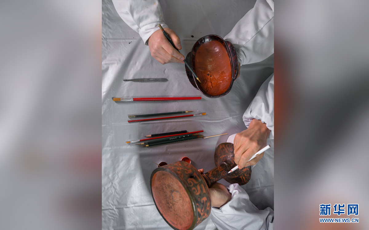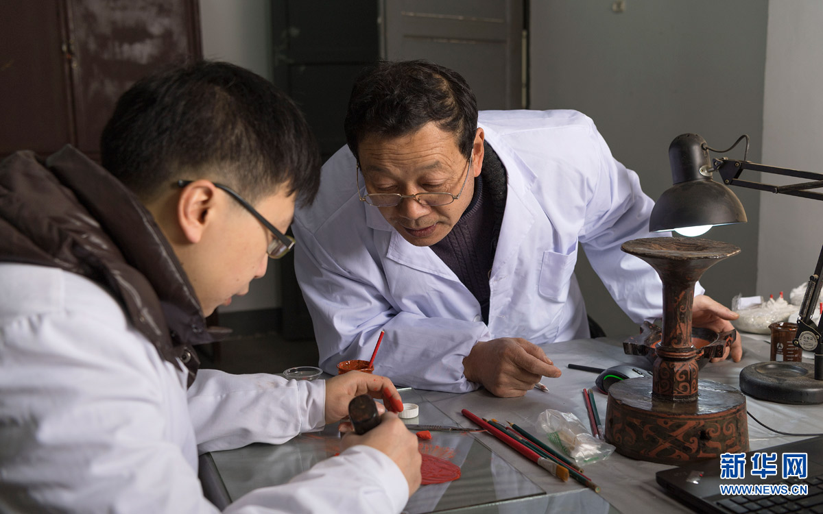 1月10日,杜道子(下)和同事在修復竹木漆器文物。年過六旬的杜道子是湖北省荊州文物保護中心的竹木漆器文物修復專家、楚式漆器修復技藝傳承人。原本褪色、破損、殘缺的竹木漆器,經過他的修復,都能重放光彩,再現當年的神韻。杜道子從小便接觸學習繪畫、木雕,后來學習工藝美術專業的他開始從事傳統美術設計工作。1987年,杜道子作為專業性人才被引進荊州博物館,從此開始正式進入竹木漆器修復行業。至今他從事竹木漆器文物修復工作已30年。在此期間,杜道子修復的竹木漆器文物超過兩千件,其中包括荊州出土的虎座鳳架鼓、湖南長沙馬王堆出土的朱地彩繪棺等國家重點文物。荊州文物保護中心的竹木漆器文物修復水平在全國領先,每年都有大量全國各地的竹木漆器文物送來進行修復。這些送修文物病害各不相同,修復工藝繁瑣,從清洗、脫水、干燥,到髹漆、彩繪、封護等等,要進行十幾個步驟才能讓沉睡的文物“復活”。杜道子說:“文物修復是一門藝術,琢磨久了,同手里的竹木漆器間也像有了對話一般,通過不同的漆面、紋理,就能琢磨出這件文物在千年前的用途和使用環境。看到一件件竹木漆器在自己手里重獲‘新生’,一種自豪感便會油然而生。” 新華社發(熊琦 攝)