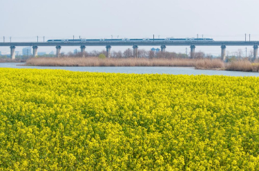 春日,在安徽省合肥市肥东县十八联圩生态湿地,油菜花竞相绽放,铺展成金色花海。高铁列车穿行其间,与碧水、飞鸟相映成趣,勾勒出一幅生动多彩的江淮大地春日图景。