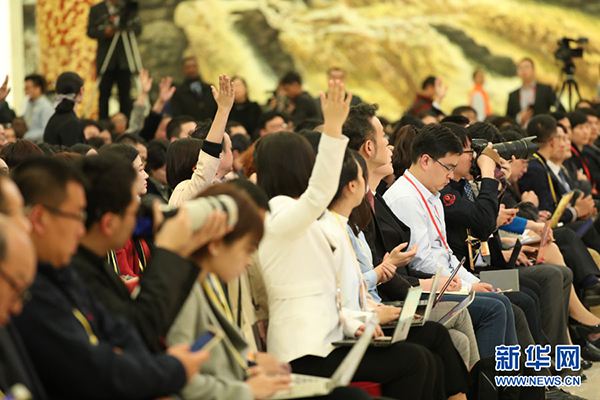 2017年10月17日下午,中國共產黨第十九次全國代表大會新聞發言人在人民大會堂三樓金色大廳舉行新聞發布會,并回答中外記者提問。圖為記者在現場踴躍提問。新華網 翟子赫 攝