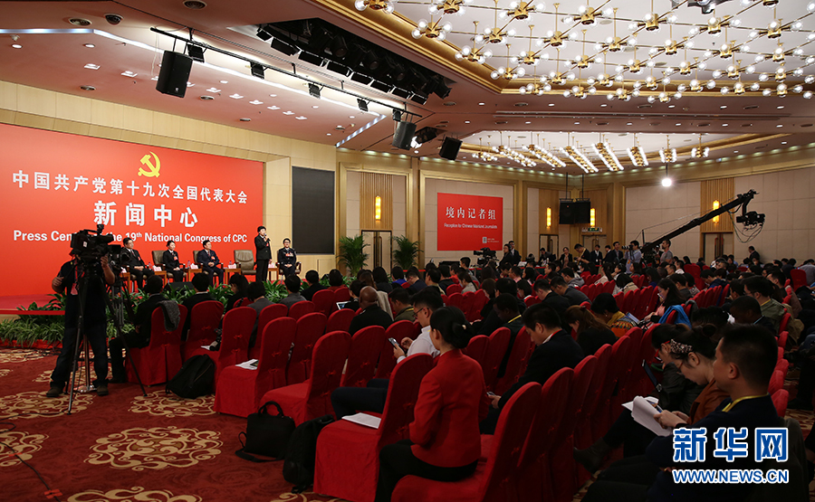 ??? 10月19日,十九大新聞中心舉辦集體采訪,邀請政法戰線代表談全面推進依法治國。圖為采訪現場。新華網 郝廣鵬攝