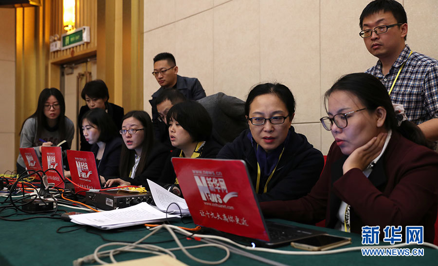 ??? 10月20日,十九大新聞中心舉行記者會(huì),邀請(qǐng)中宣部、中央文明辦、文化部、新聞出版廣電總局相關(guān)負(fù)責(zé)人介紹加強(qiáng)思想道德和文化建設(shè)情況,并回答記者提問。圖為新華網(wǎng)在現(xiàn)場(chǎng)直播。新華網(wǎng) 郝廣鵬 攝