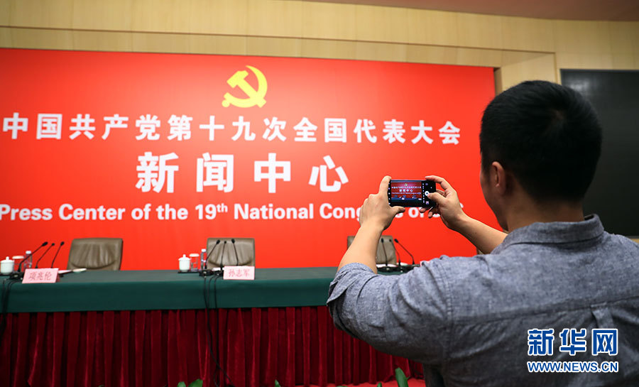 ??? 10月20日,十九大新聞中心舉行記者會,邀請中宣部、中央文明辦、文化部、新聞出版廣電總局相關負責人介紹加強思想道德和文化建設情況,并回答記者提問。圖為記者在現場拍攝。新華網 郝廣鵬 攝