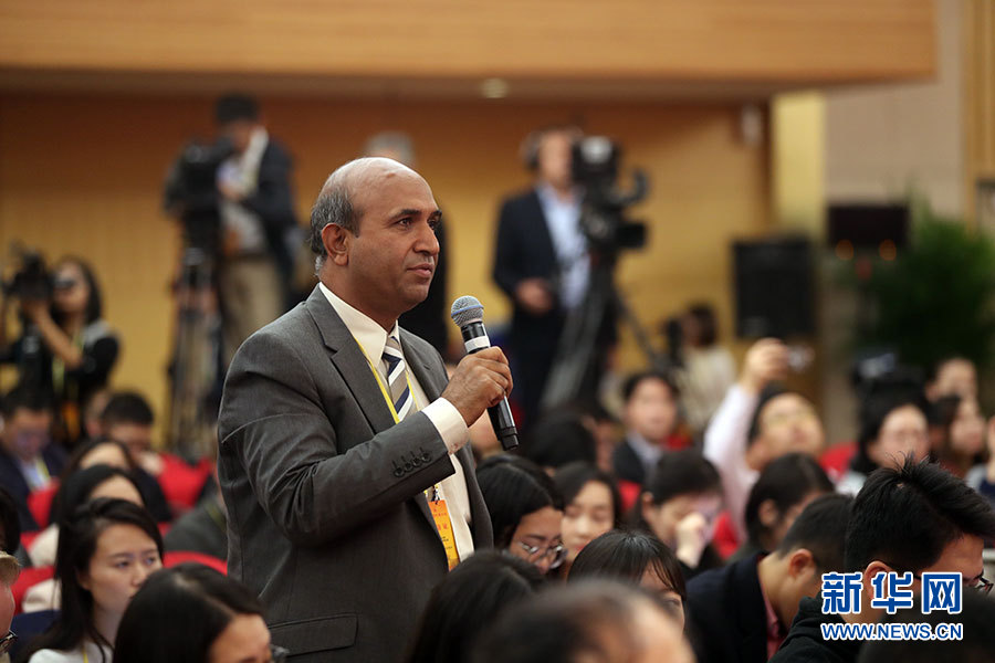 10月21日,十九大新聞中心舉辦記者招待會,邀請中共中央統戰部常務副部長張裔炯、副部長冉萬祥,中共中央對外聯絡部副部長郭業洲介紹黨的統一戰線工作和黨的對外交往情況,并回答記者提問。圖為巴基斯坦聯合通訊社記者提問。新華網 郝廣鵬攝