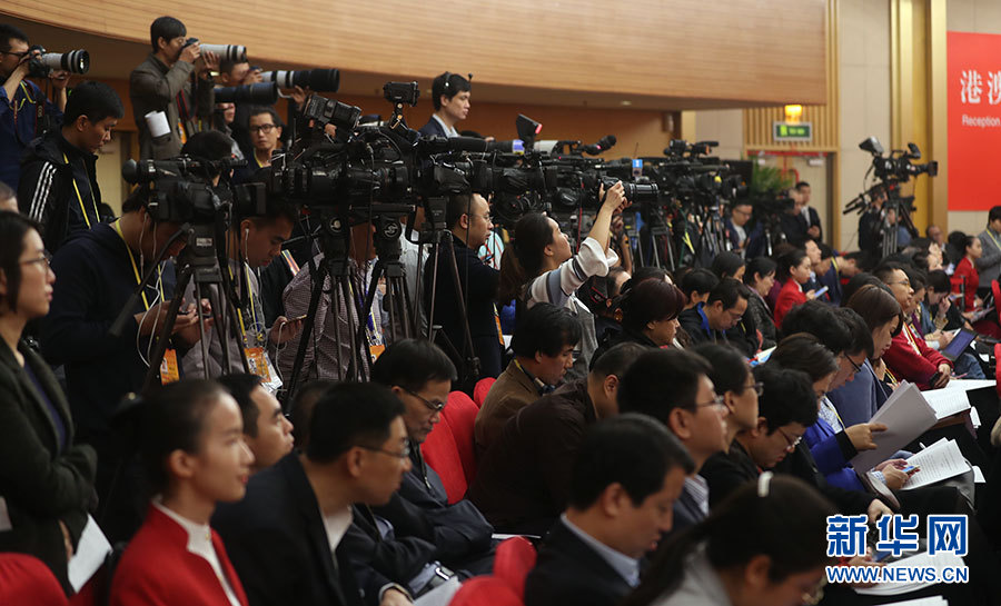 10月22日,十九大新聞中心舉辦記者招待會,邀請教育部黨組書記、部長陳寶生,民政部黨組書記、部長黃樹賢,人力資源社會保障部黨組書記、部長尹蔚民,住房城鄉建設部黨組書記、部長王蒙徽,國家衛生計生委黨組書記、主任李斌介紹滿足人民新期待,保障改善民生有關情況,并回答記者提問。圖為現場記者。新華網 郝廣鵬攝