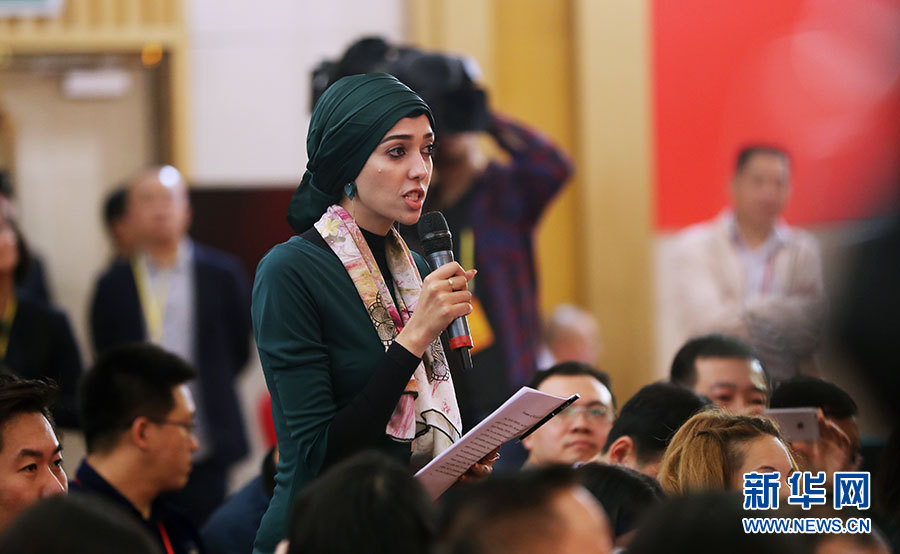 10月22日,十九大新聞中心在梅地亞中心二層新聞發布廳舉辦集體采訪活動,主題為“中國特色強軍之路邁出堅定步伐”。圖為迪拜中阿衛視記者提問。新華網 郝廣鵬攝
