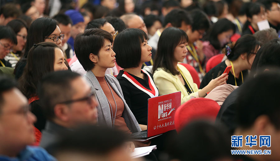 10月23日,十九大新聞中心舉辦記者招待會,邀請中央財經領導小組辦公室副主任楊偉民,環境保護部黨組書記、部長李干杰介紹踐行綠色發展理念,建設美麗中國有關情況,并回答記者提問。圖為現場記者。新華網 郝廣鵬攝